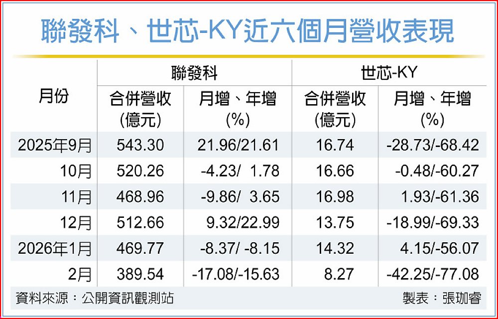 世芯-KY 2月合併營收為8.27億元,月減42.25%、年減77.08%,累計前二月營收22.59億元,年減67.11%。營收規模持續縮水,公司表示,主因為量產產品減少所致。側面反映去年大型量產專案高基期效應消退,也凸顯ASIC產業高度仰賴專案時程與量產節奏的特性。