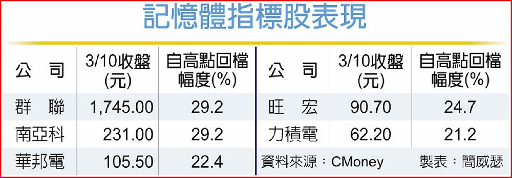 記憶體指標股南亞科10日反彈攻上漲停至231元,華邦電、群聯、力積電也都反彈,旺宏則逆勢收黑。但整體而言,五檔記憶體指標股股價從波段高點以來,均拉回2~3成左右,表現並不突出。