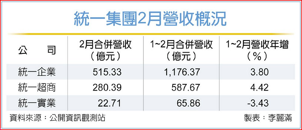 農曆春節前後帶動民生需求動能強勁,統一企業在食品本業、統一中控、統一超商等三本柱業績成長挹注下,2月合併營收達515.33億元、年增8.32%,累計前二月合併營收1,176.37億元、年增3.8%,單月與累計營收均創同期新高。展望3月雖屬年後傳統淡季,但在運動賽事與春遊等題材帶動下,法人仍樂觀統一業績持續增長。