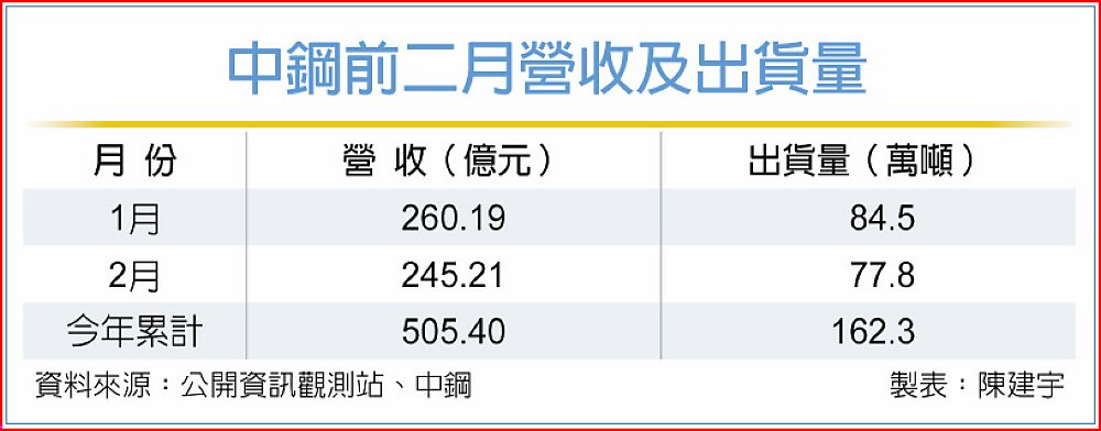 今年鋼鐵市場景氣開始復甦,不過中鋼2月營收245.21億元並不出色,月減5.76%、年減12.93%,累計前二月營收505.40億元、年減6.19%。