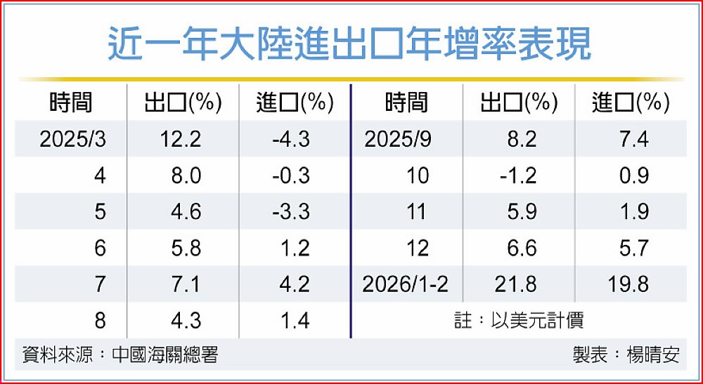 值得注意的是,大陸海關罕見地公布2月單月數據。2月出口激增39.6%;進口大增13.8%。中國海關總署自2020年起,固定將1月與2月的進出口數據合併公布,以避免春節每年日期不同所造成的波動干擾,自此鮮少公布1月或2月單月數據,海關本次公布2月數據,凸顯該期間外貿表現強勁。