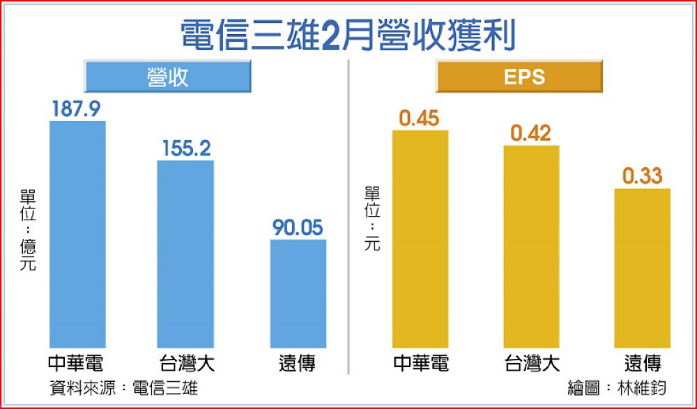 電信三雄2月營收獲利亮晶晶,中華電合併營收187.9億元、稅後純益34.2億元、每股稅後純益(EPS)0.45元,皆創近十年同期新高。台灣大以單月每股賺0.42元緊跟在後,前二個月稅後純益26.5億元,年增10%。遠傳2月營收獲利更創同期歷史新高。
