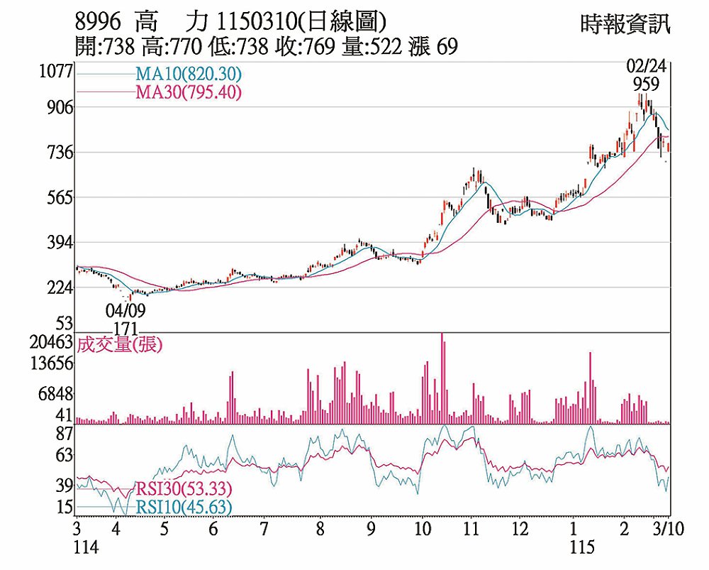 高力(8996)在2月營收持續高檔帶動下,10日股價開高走高,終場收769元、上漲69元,因受分盤交易處置,成交僅504張。去年4月回檔至波段低點171元後,隨熱能產品及液冷散熱產品出貨旺帶動業績提升出量上攻,數度回測季線未破,日前創959元新高後隨大盤轉弱,拉回修正,10日跳空紅K重返5日線之上,短線KD指有望交叉向上,短線轉多。