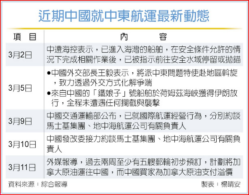 外傳3月初,中方曾與伊朗進行談判,爭取讓運輸原油與液化天然氣的船隻得以安全通過荷姆茲海峽。同時,中國也派出中東問題特使翟雋赴海灣國家斡旋。