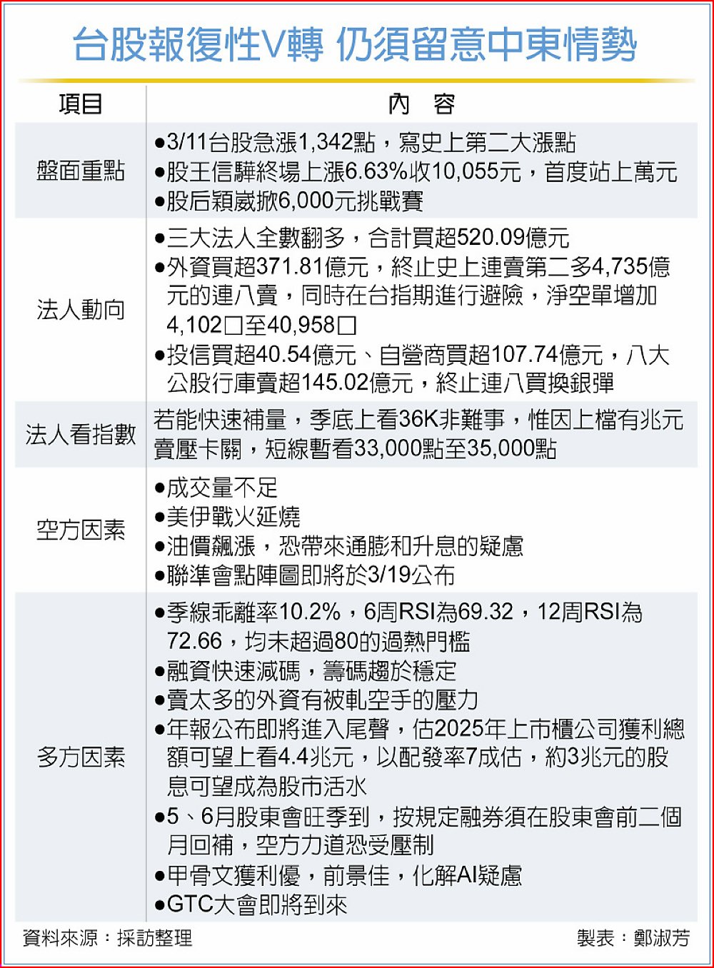 甲骨文法說會報佳音及油價回跌,外資11日認錯回補371.81億元,終止史上連賣天數合計第二多的4,735億元,權王台積電、股王信驊雙帥領軍,信驊並首度以10,055元站上收盤萬元關卡,帶領台股上演V轉戲碼,加權指數終場大漲1,342點創下史上第二大漲點,收34,114點、收復所有均線並連攻33K與34K,法人認為,3月季底前坐穩35K、眺望36K機會仍大。