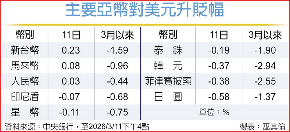 主要亞幣11日大致拉回走貶,僅新台幣漲幅0.23%最強勢,及人民幣微揚0.03%、馬來幣小升0.08%,其餘幣別跌幅0.07%~0.58%,主要是美元指數續在高檔有撐,日圓單日跌最深。