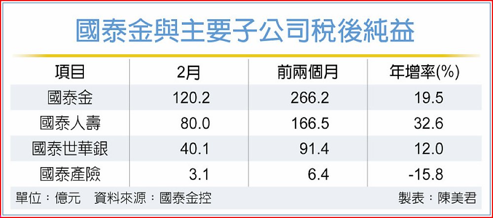 國泰金2月獲利表現亮眼,國泰世華銀行、國泰證券及國泰投信累計稅後純益皆創歷年同期新高,國泰產險創歷年同期次高。