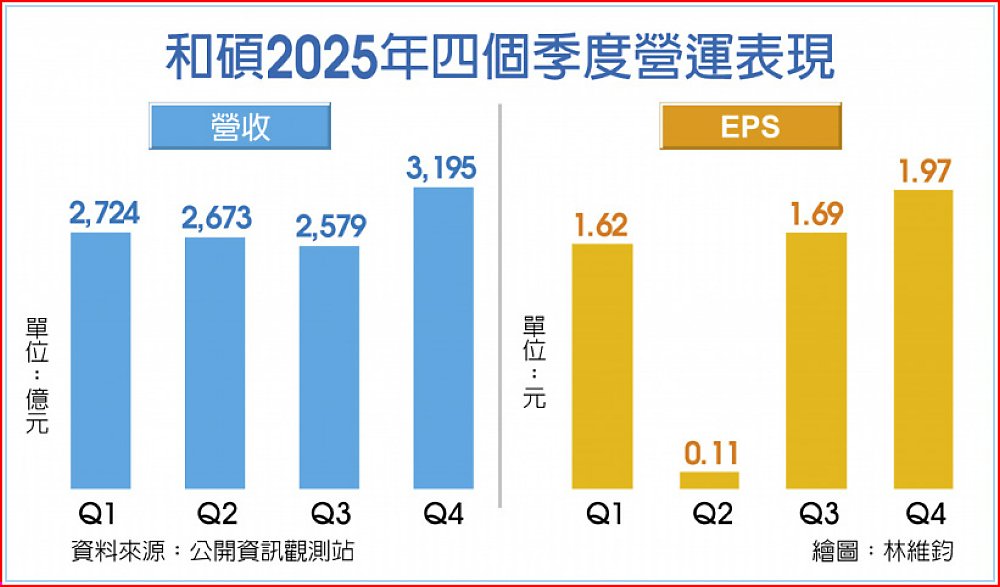 和碩2025營收達1.12兆元,毛利率3.8%,稅後純益144.03億元,每股稅後純益(EPS)5.39元。和碩董事會也通過擬配發現金股利4元,以11日收盤價70.1元計算,現金殖利率約5.71%。