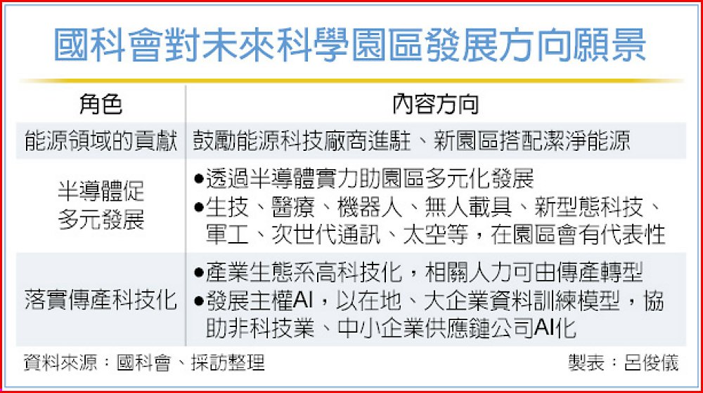 國科會主委吳誠文11日表示,未來園區發展不但要照顧到生態、環境永續,也要在能源領域有所貢獻,包括鼓勵能源科技廠商進駐。他並提及,要以半導體實力促進園區多元化發展,及傳統產業科技化,讓傳產人才轉型,進入到各種高科技業生態系中。
