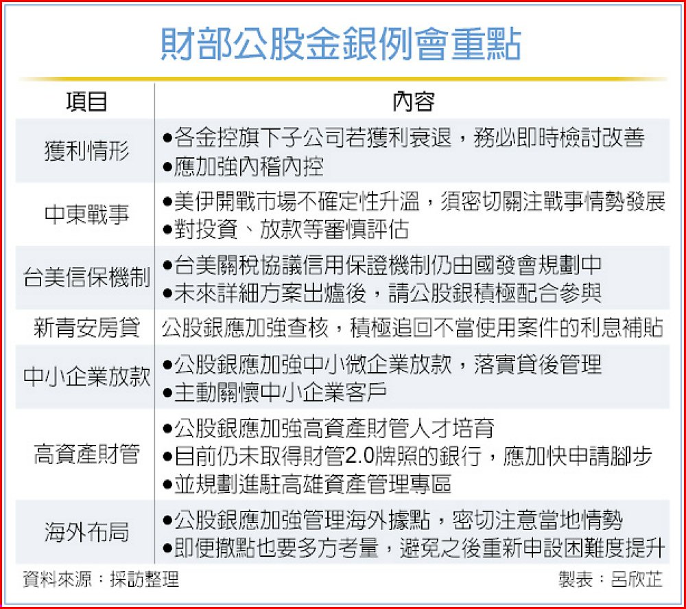 財政部11日召開公股金融事業業務研討會,此一財長莊翠雲主持的會議,主要聚焦各公股金控與銀行獲利情形、中東戰事、台美關稅協議信用保證機制,及新青安房貸等七類議題。與會人士透露,財政部重視地緣政治影響下的各金控子公司獲利,提醒如有衰退情形,要即時檢討改善,同時應加強內稽內控。公股銀行要關注美伊戰事發展,審慎評估投資、放款。