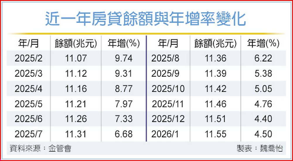 國銀1月房貸餘額悄增溫。金管會11日公布,至今年1月底房貸餘額達11.55兆元、續創史上新高,年增率達4.5%、終結連續15個月下降。金管會指出,房貸餘額連續14個月站上11兆元,較上月增392.38億元,但1月主要受到春節假期落點不同影響,至於房貸餘額持續攀高,顯示國人自住的剛性購屋需求仍在。