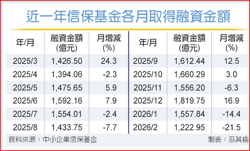 主要機構預估今年國內景氣持續亮眼,企業投資需求帶動資金潮,但2月因農曆春節長假,企業融資需求暫時降溫。信保基金統計,2月承保金額1,019.47億元,協助取得融資金額1,222.95億元,連續二個月下滑,創近一年新低,但仍是連續36個月、即整整三年來,單月均破千億元大關。
