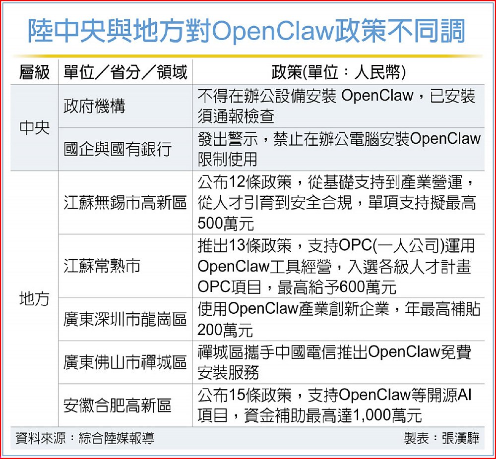 外媒引述知情人士透露,包括大型國有銀行在內的多家政府機構與國企,近日已經被要求不得在辦公電腦安裝OpenClaw軟體。部分單位同時要求員工若是已經安裝相關應用,須主動回報,以便進行資安檢查並且視情況移除軟體。此外,至少15家券商明文要求,員工不得未經核准使用OpenClaw,使用須經審批並且報備。