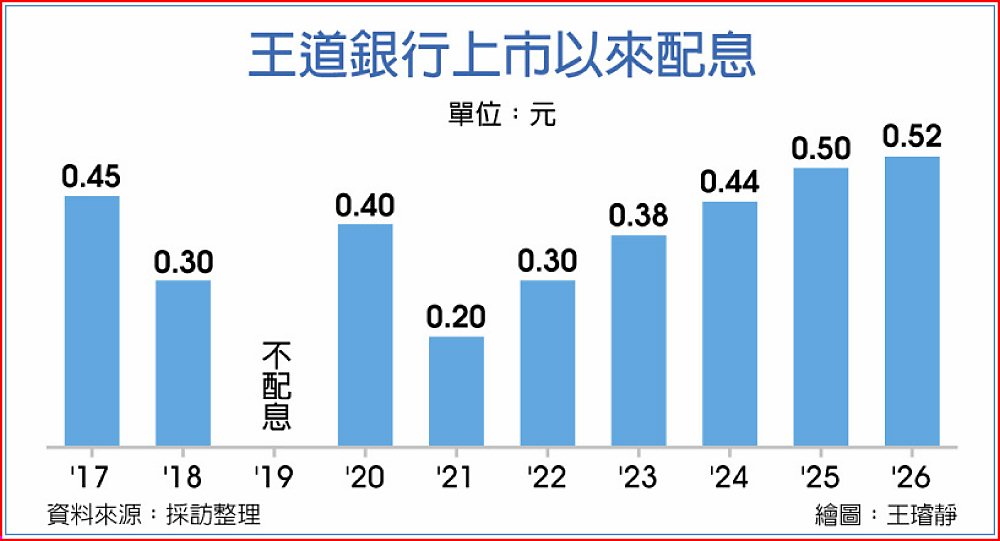 王道商業銀行11日公告董事會決議2025年盈餘分配案,普通股每股擬配發現金股利0.52元,創2017年掛牌上市以來的史上新高水準。王道銀董事長駱怡君先前喊出「Dig Deep(向下挖深)」三年計畫,2026年進入第三年,獲利穩健成長,並帶動配息持續創高。