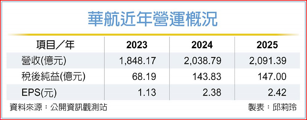 中華航空11日公告去年財報,全年營收2,091.39億元、稅後純益147億元、每股稅後純益(EPS)2.42元,三項數字均創新高。今年華航預計交付新機14~16架,運力大增,3月起將陸續增班釜山、布拉格、紐約等航線,兵分三路掌握亞、歐、美洲客貨運成長契機,同時鞏固市占率。