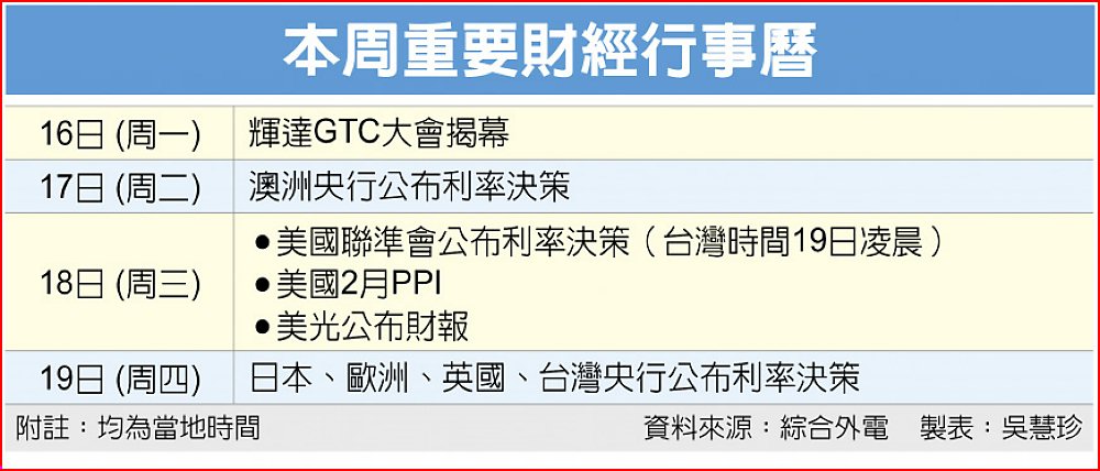 展望本周,投資人除持續關注中東戰局發展,也將聚焦16日登場的輝達GTC大會及18日出爐的美光財報。此外美歐日英澳等央行皆在本周召開例會。