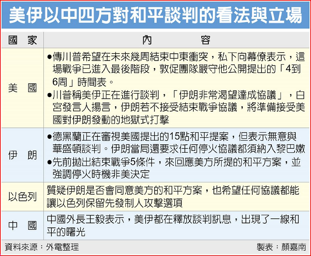 不過現階段離停戰仍有不小的距離,美伊依然各說各話,美國稱伊朗急欲談和,而德黑蘭表示僅在審視和平提案,無意談判。