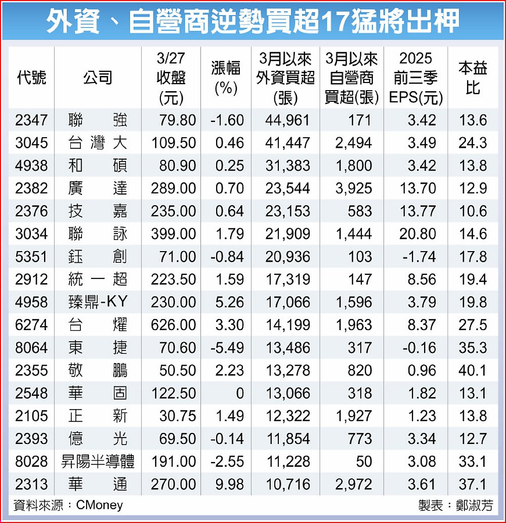 中東戰事遲遲未落幕,內外資憂心難未解,外資、自營商3月以來拚命賣股、落袋為安,光3月就出現逾兆賣超,比去年一整年賣超金額還多。雙強賣壓罩頂下該如何投資,法人觀察到,仍有代工雙雄廣達、和碩領軍的17檔個股,外資、自營商都愛,股價搶先大盤站上月線率先表態,有望領航4月行情。