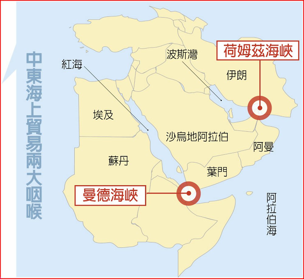荷姆茲海峽每日運2,090萬桶石油、占全球21%;曼德海峽日運420萬桶、占6%。兩者合計,控制近30%海運石油流量。高盛指出,一旦中東海上兩大海峽遭到封鎖,將阻斷中東石油外運,船隻將被迫繞非洲好望角,運費、保險將暴增3成以上,將是史上最大石油供應衝擊,全球經濟衰退風險升高。