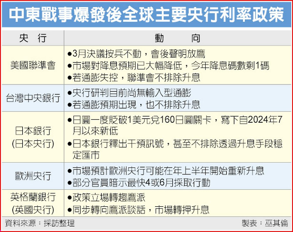 美伊戰事難見和談曙光,加上葉門叛軍胡塞組織等加入戰局,荷姆茲海峽外再傳可能波及紅海運輸,推動國際油價續漲,市場憂心輸入型通膨襲來。中央銀行總裁楊金龍30日表示,目前央行以全年油價每桶85美元預估,上修今年消費者物價指數(CPI)年增至1.8%,但若全年均價來到100美元,通膨率將來到1.9%左右,至於是否有可能超過1.9%、甚至直逼2%警戒線,第二季將是關鍵。