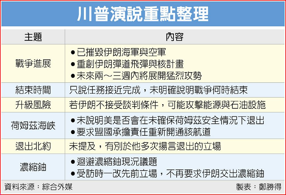 川普指出,美軍正接近完成任務,並重申要將伊朗「打回石器時代」的威脅,他未提出結束衝突的具體計畫,僅表示,將「很快」結束這場戰爭,「我們手握所有籌碼,他們一張牌都沒有。」演講裡也迴避了棘手的話題,包括濃縮鈾的現況,與荷姆茲海峽重啟等問題。