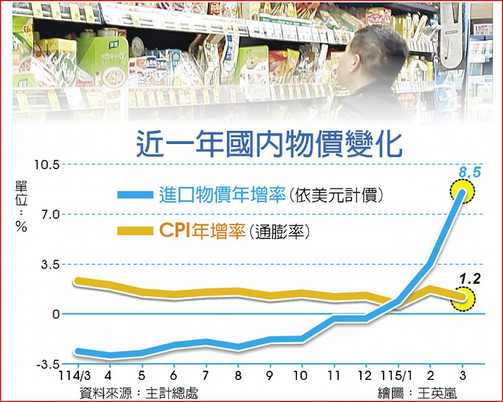 主計總處8日公布3月物價指出,雖近期原油大漲推升國內油料費,但由於政府擴大物價平穩機制,油料費只比2月上漲6.5%,加以水果價格大跌,3月通膨率降至1.20%,排除春節因素後創五年來最低。目前尚無輸入性通膨,估計4月仍將低於2%。