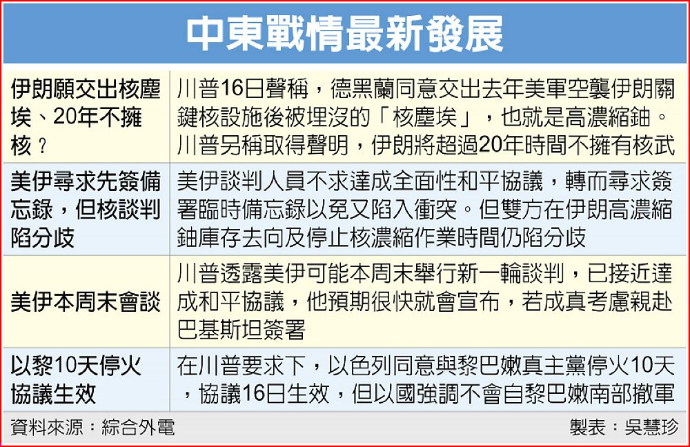 美伊和解跡象日益明顯,《華盛頓郵報》16日報導,川普在白宮告訴記者,德黑蘭同意交出去年美軍空襲伊朗關鍵核設施後,被埋沒的「核塵埃」(nuclear dust),也就是高濃縮鈾。若所言屬實,美國削弱伊朗核武製造能力的努力,邁出重要一步。
