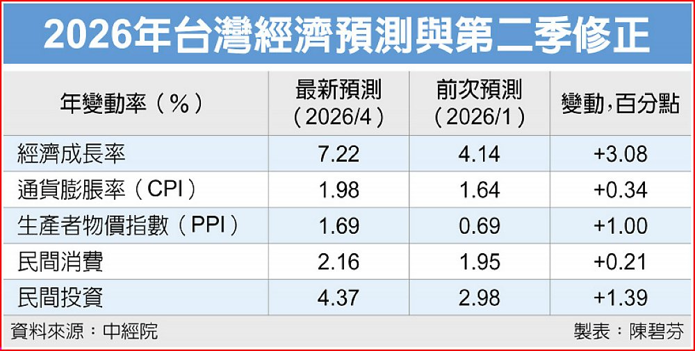 美伊戰事延燒逾月,主要機構下修全球及大多數國家的經濟成長,台灣卻為少數的例外!中華經濟研究院17日表示,受惠AI科技蓬勃發展與需求,今年第一季出口超乎預期暢旺,啟動經濟成長亮麗的表現,中經院上修全年經濟成長率至7.22%,較1月間預測大幅上修逾3個百分點,逆勢全球的放緩走勢。