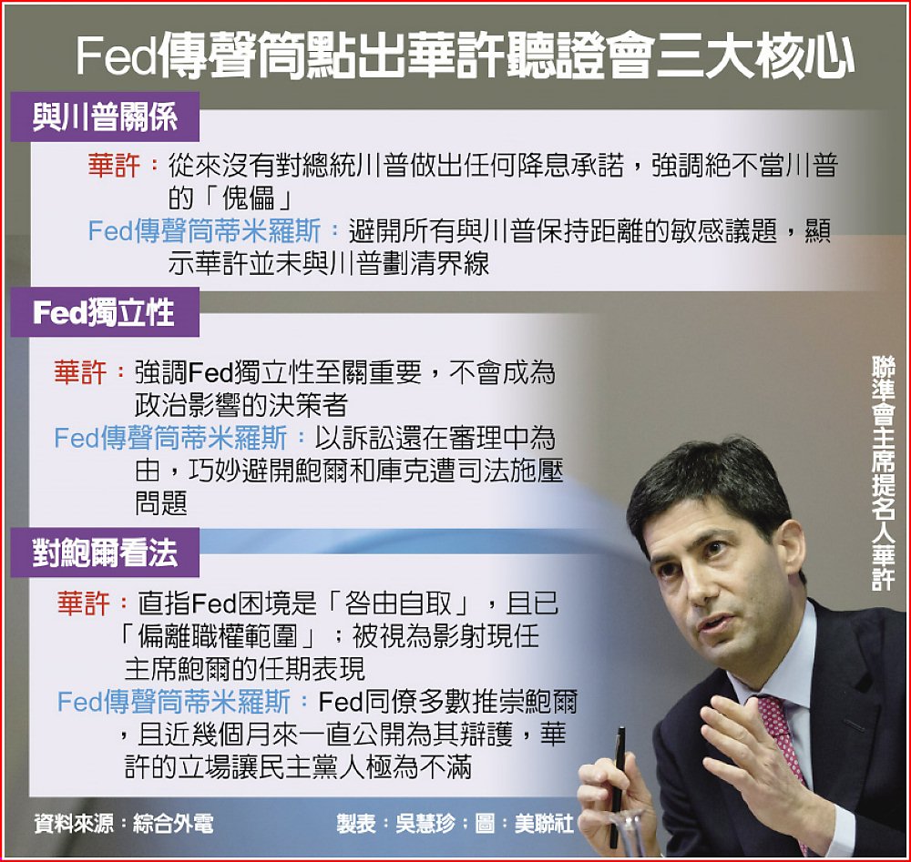 被封為「聯準會傳聲筒」的華爾街日報記者蒂米羅斯(Nick Timiraos)則發文,指聽證會有三大觀察重點:一、華許被問及川普的經濟政策,是否有不認同之處,以玩笑話帶過未正面回應,看似拒絕與川普劃清界線;二、華許強調Fed獨立性,但對川普意圖解雇理事庫克、總部大樓裝修遭刑事調查問題,以訴訟還在進行迴避;三、華許對Fed獨立性的詮釋,讓內部覺得刺耳。他在證詞中一再抨擊現任主席鮑爾表現,稱Fed已偏離職權範圍,但Fed內部對鮑爾有極高的評價。